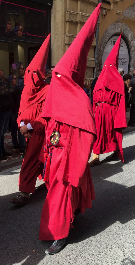 Usually on Good Friday, Perpignan and other towns in the French Catalonia celebrate with the procession of La Sanch, full of people in peaked, masked robes. These are not the world’s most fashionable garments, so perhaps an explanation is required.