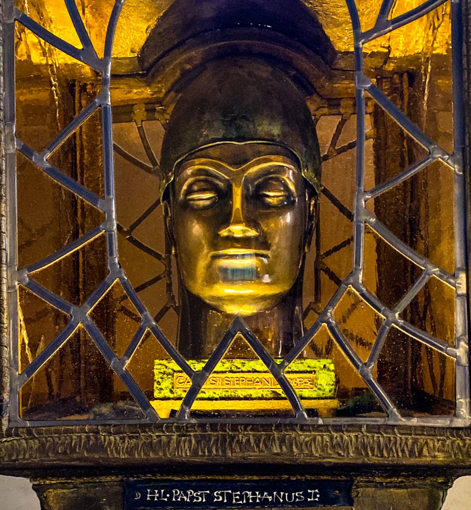 The cathedral became the favourite resting place of all the Salian emperors, from Conrad himself to Henry V, who died in 1125. Assorted later medieval German kings (who were not crowned emperors) have also been buried there, including Rudolf I von Habsburg, who established the eponymous royal and imperial house. The location of the graves was lost over the centuries, and all were excavated and relocated in the crypt in 1900-1906. Besides graves, the cathedral has – as usual – a reliquary with assorted body parts of various saints, including the partial head of pope Stephan I in a fetching bronze vessel (see below).