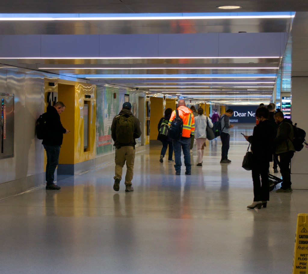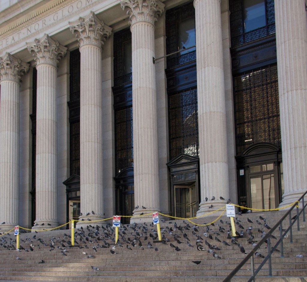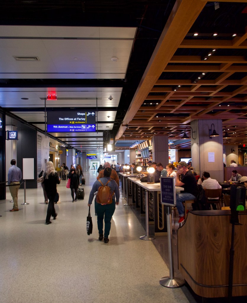 The Long Island Railroad tracks are tucked downstairs from the Amtrak hall, and the ceiling is low, but at least the layout is clear. Thus the new hall is an improvement, although the exterior requires some repurposing – reserving a waiting area for pigeons does not seem fully thought through.