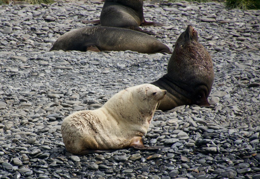 You can spot a rare white-furred seal on the shores (above) – there are small pebble beaches, although mostly the coastline is inhospitable formed of steep cliffs (below).