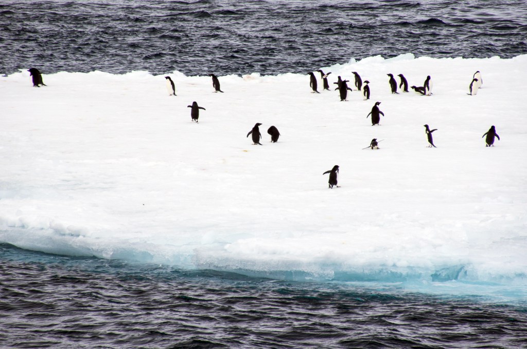 Some of the floating ice sheets have passengers on them.