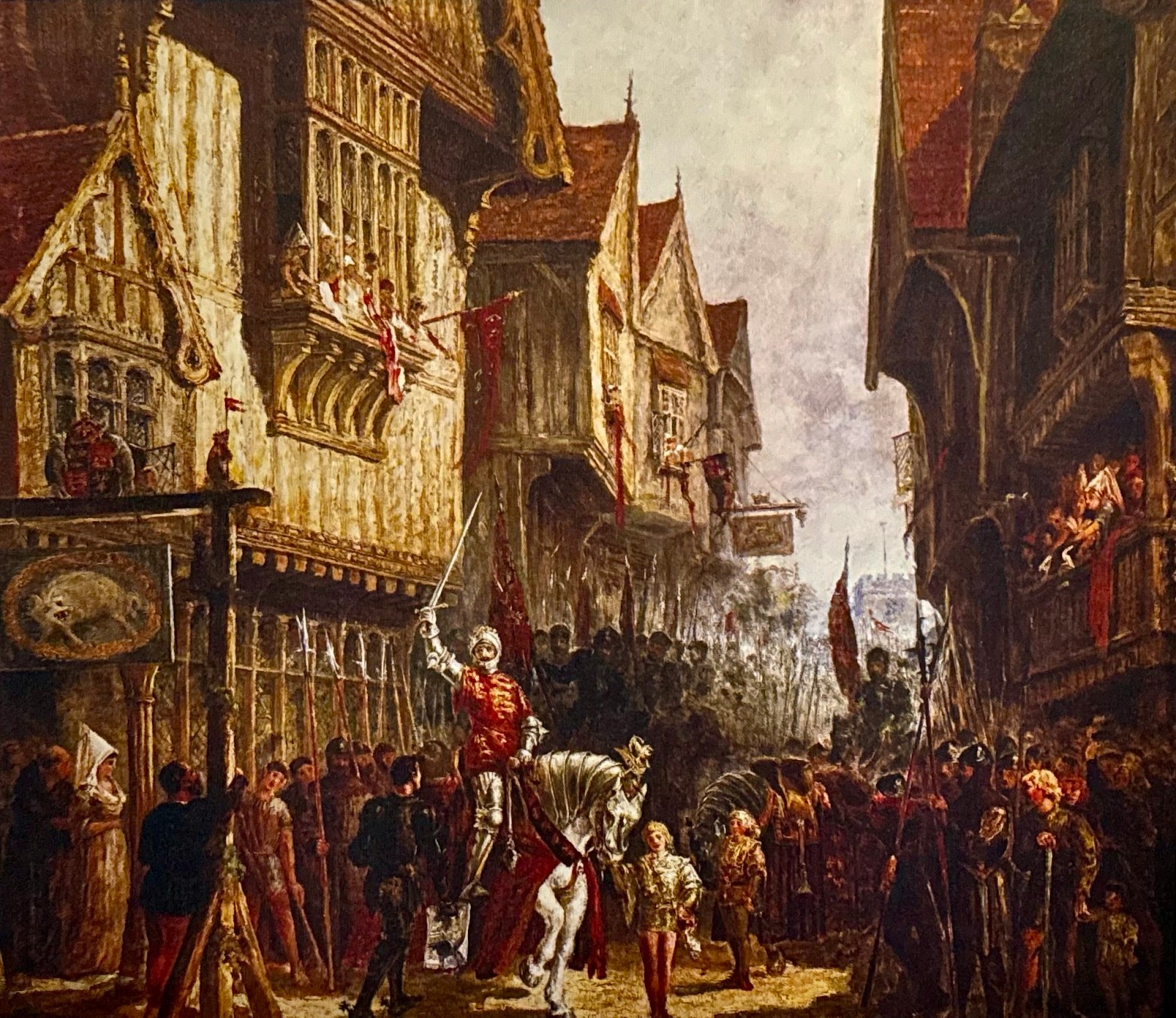 The War of the Roses culminated at the battle of Bosworth (the title picture shows an imaginary Richard before the battle), won by Richard’s opponent and next king, Henry VII Tudor. Richard was killed in battle and interred for the first time. Henry graciously built a tomb for him at the Franciscan monastery, but it was destroyed with everything else by the next king, Henry VIII, and thus began the story of the municipal car park.
