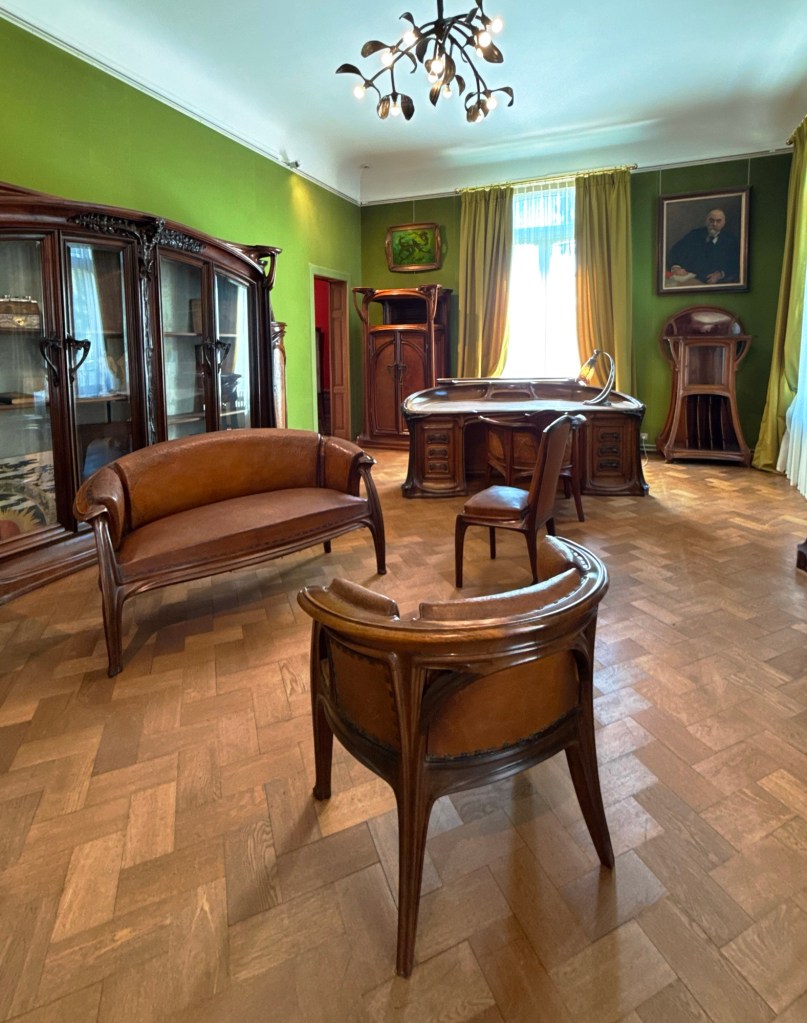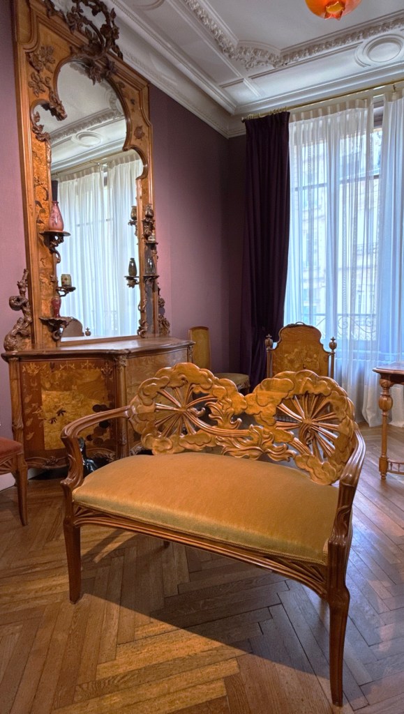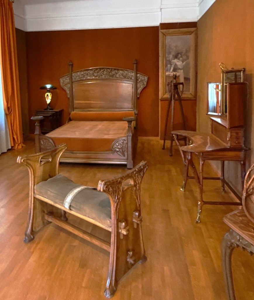 The ’Musée d’Ecole de Nancy’ provides a view of the most important local artists. Émile Gallé was a businessman cooperating with artists, but designing piecdes himself, too (a settee by him below left). As was usual, the aim was often an artistic whole, where every piece fit together to form a harmonious ensemble (below right, a dining room by Eugène Vallin and Victor Prouvé).