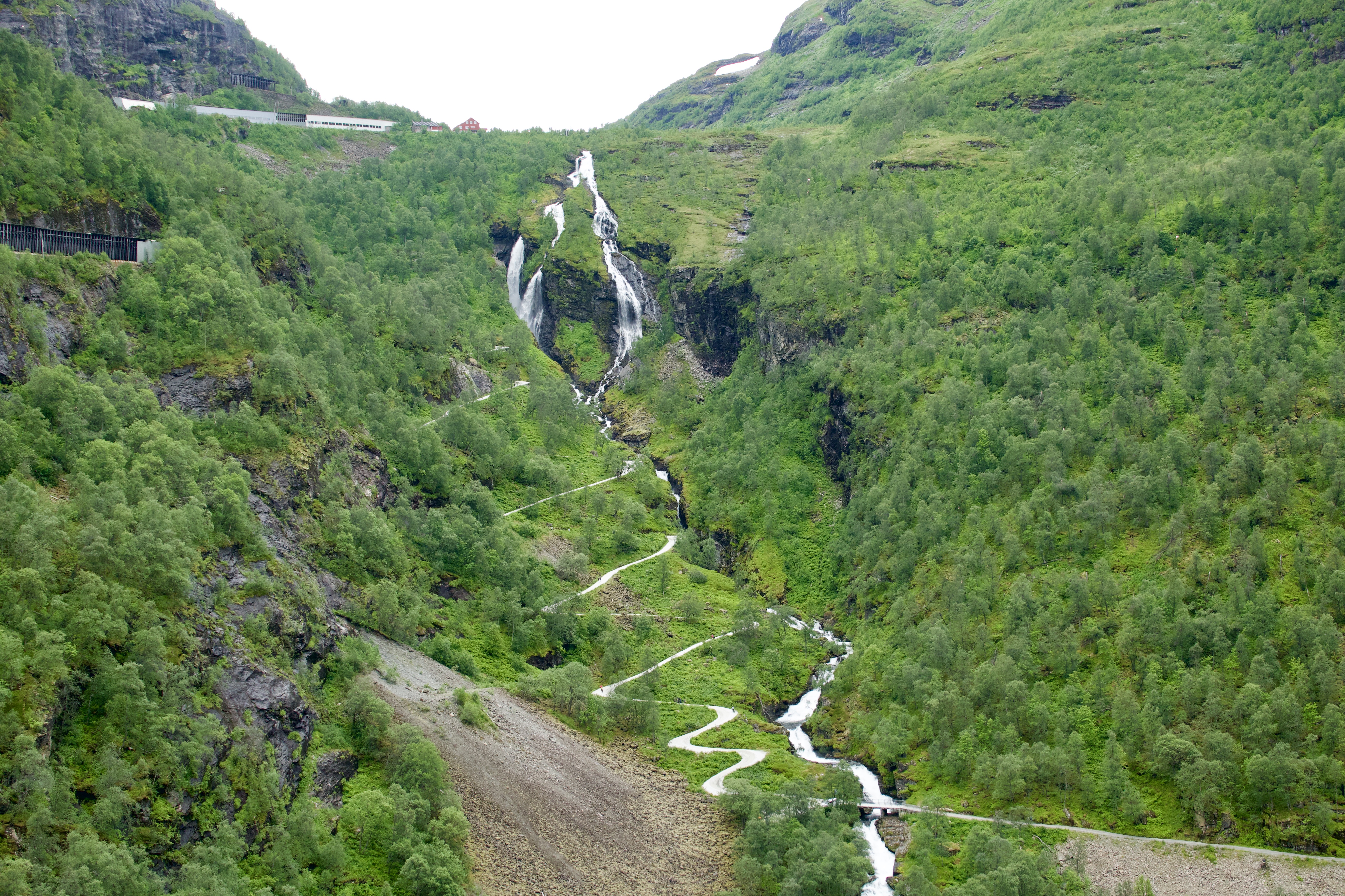 Myrdal s a non-descript stop (above left) on the Oslo-Bergen track, a bit after the highest point of that stretch (which is at 1200m above sea level). The train of the Flåmsbana (above right) requires two modern high-powered engines to clear the steep ascent and descent. If the train is not your thing, apparently the serpentine path (below left) is very popular among cyclists. And there is even a zipline for the adventurous, although the lines in the photo below right are for electricity…