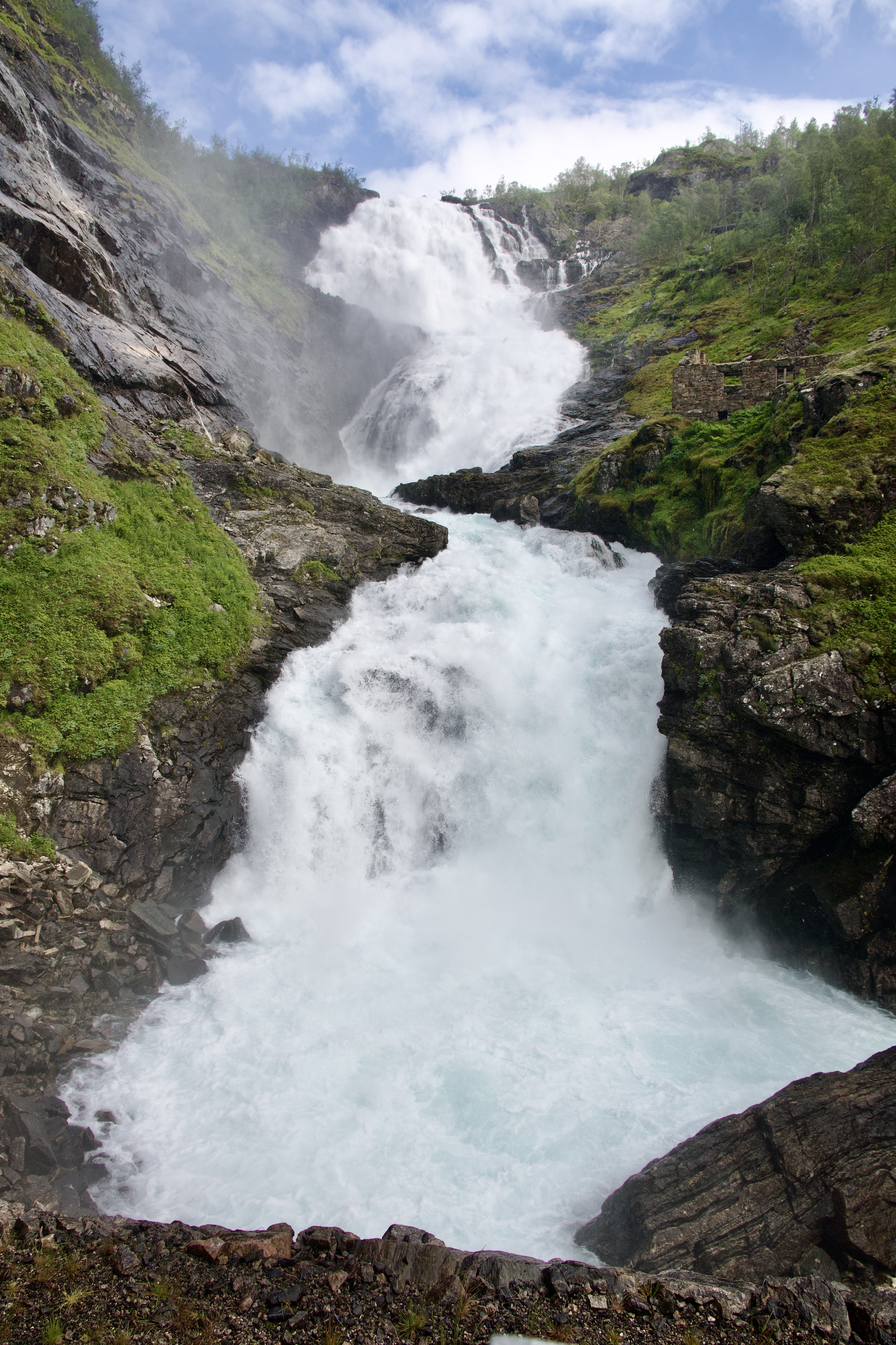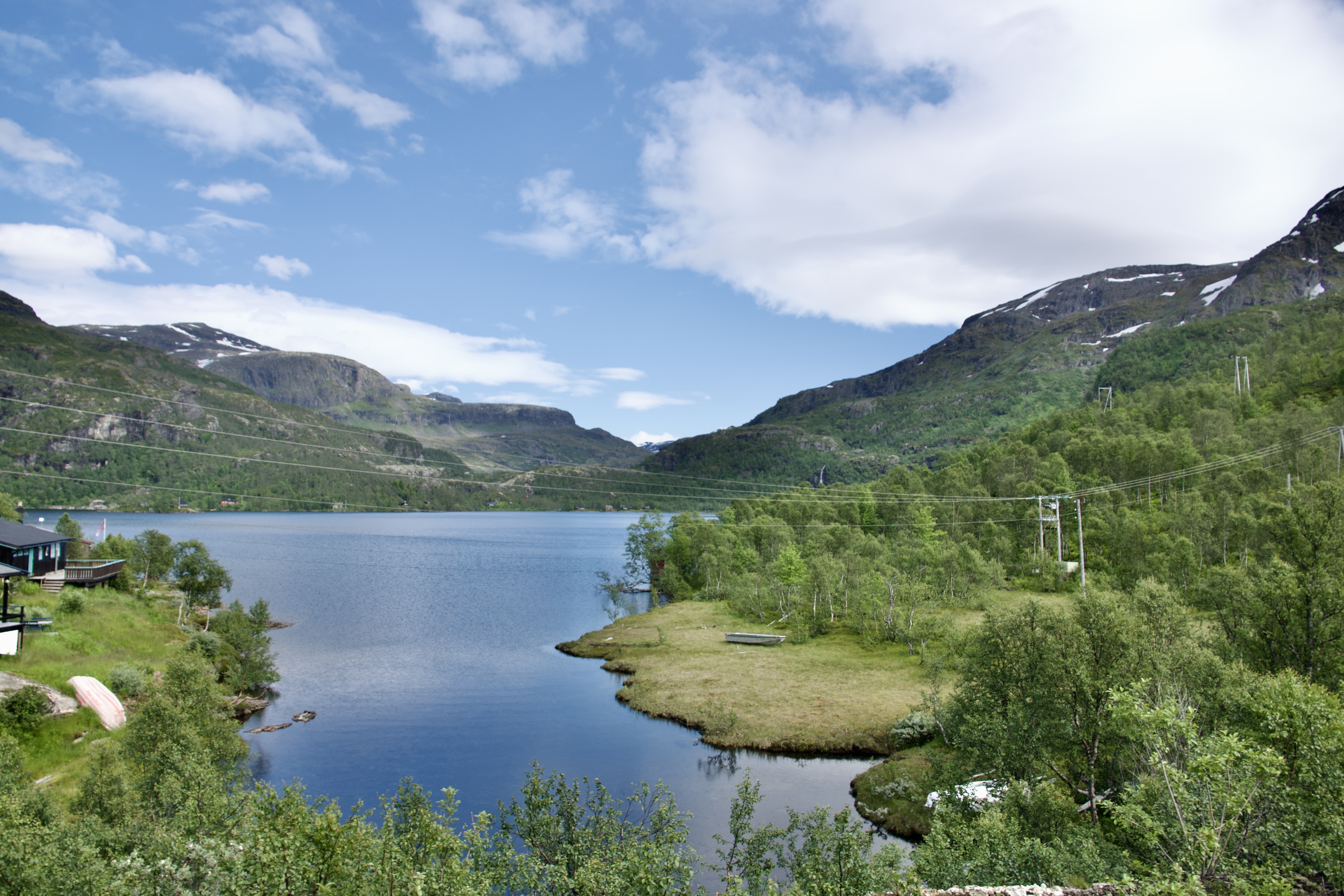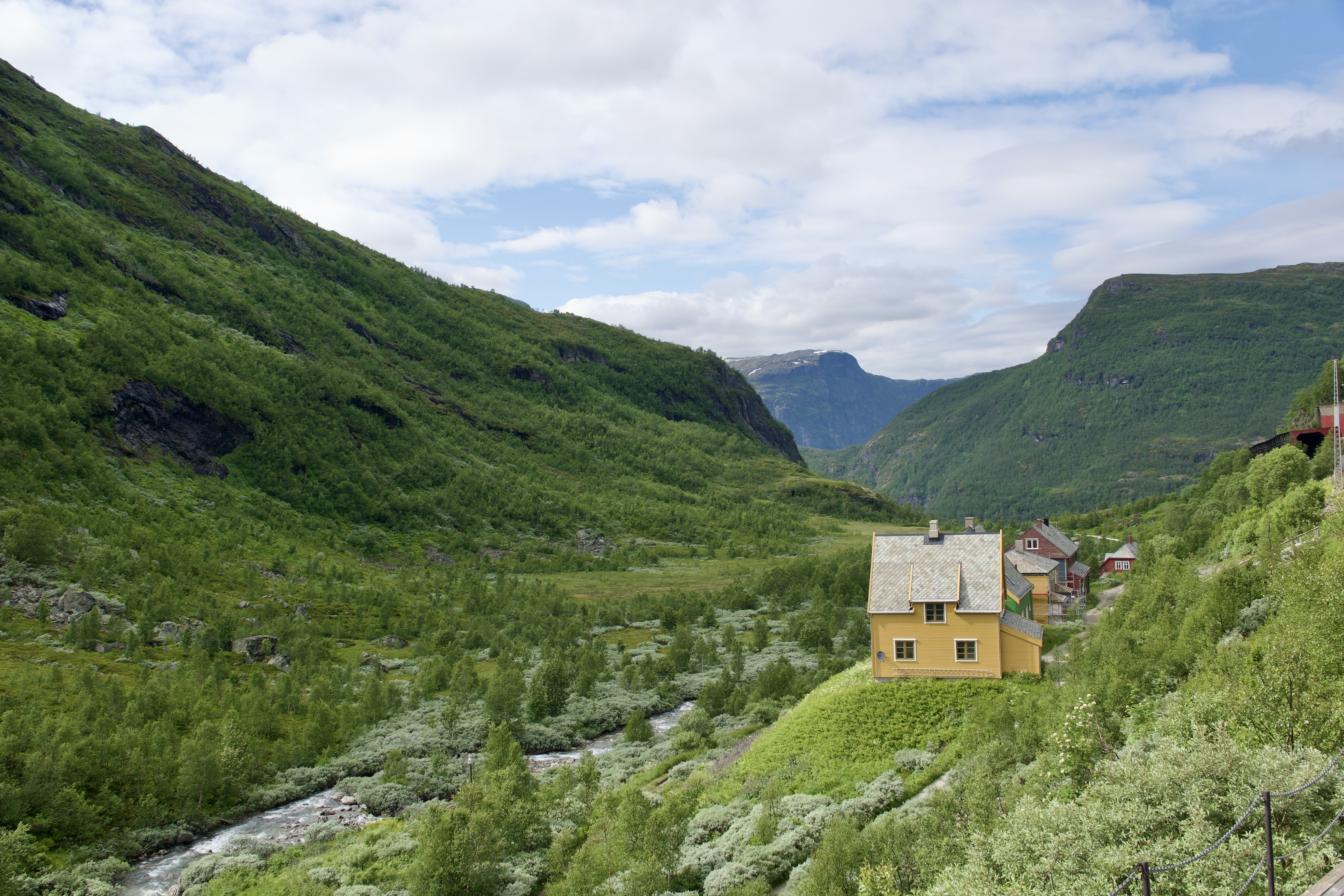The scenery along the train route is dramatic, with waterfalls (like Kjosfossen (above left), and deep valleys (above right). Colourful small houses are scattered overall (below left). The track was in planning for decades, and the construction took from 1924 to 1940. It was electrified in 1944 (first electric engine below right).