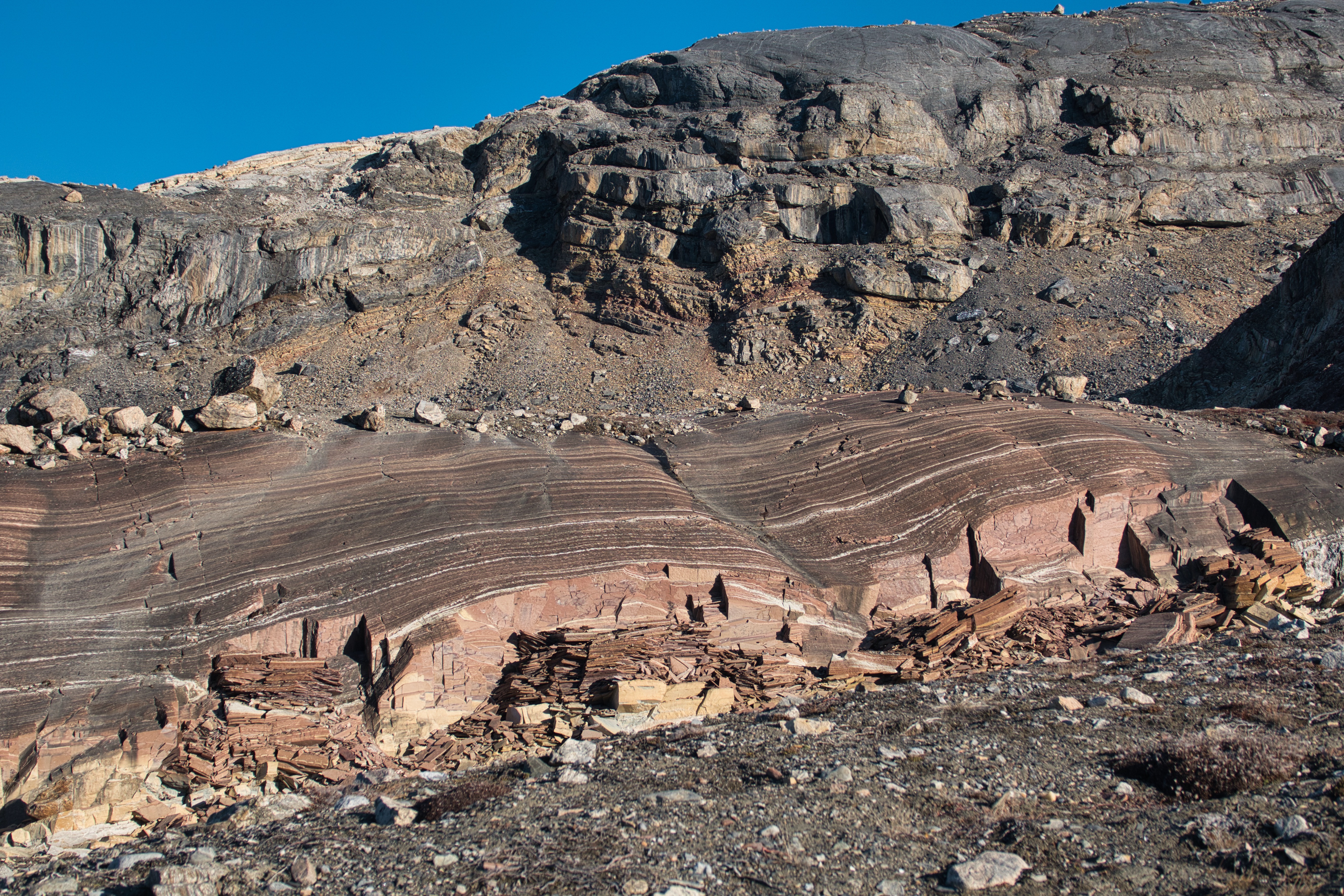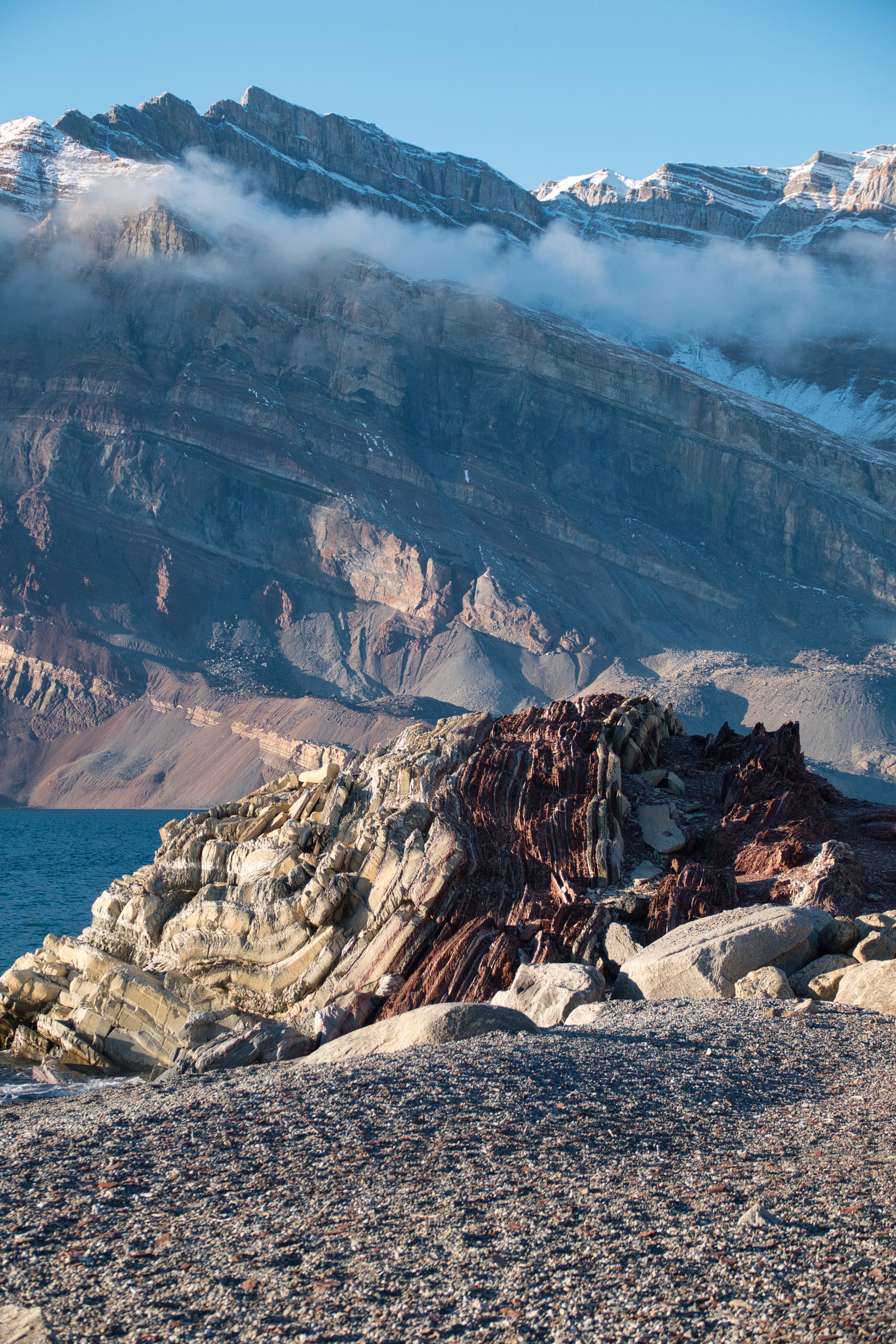 The Segelsällskapets Fjord was named after the Royal Swedish Yacht Club by a Swedish explorer. It is off the Kong Oscar Fjord, and known for its geological formations (below).