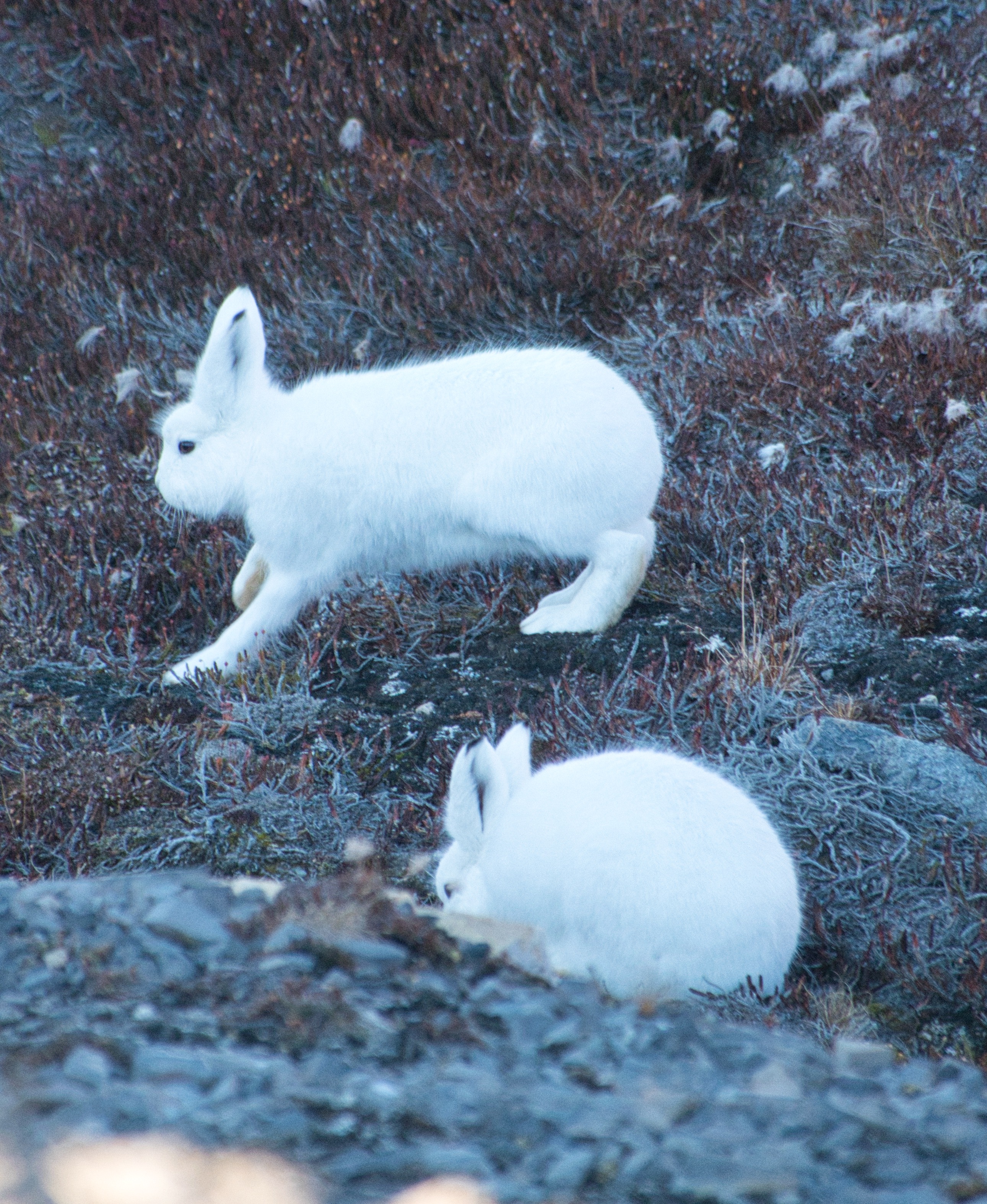 The conditions here are harsh, so life here is limited to only a few species that have adapted to them, like polar bear, musk ox, arctic hare (below), lemmings, the snowy owl and a few others. Also the vegetation is sparse and at the end of summer, there is nothing uch to eat except roots. On clear nights Northern Lights are common at these latitudes (below).