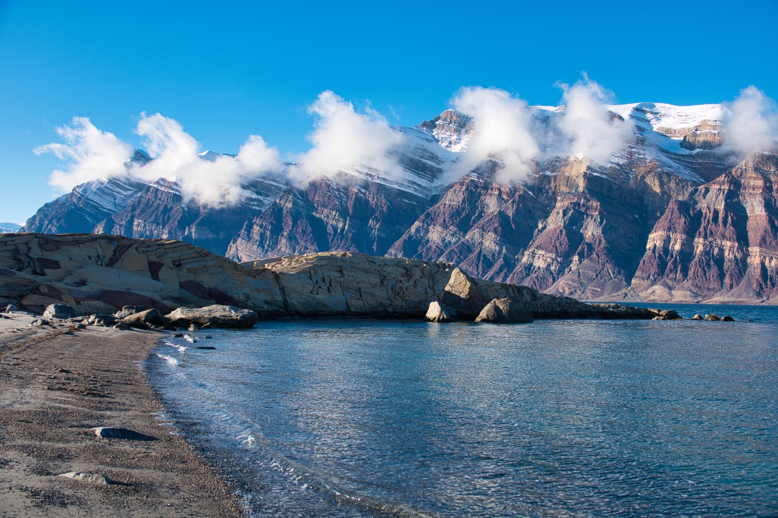 The Segelsällskapets Fjord was named after the Royal Swedish Yacht Club by a Swedish explorer. It is off the Kong Oscar Fjord, and known for its geological formations (below).