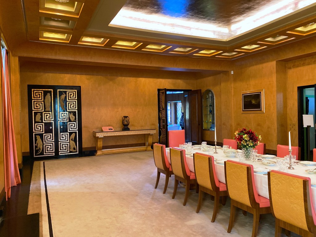 In the 1930s Stephen (inheritor of a textile fortune) and Virginia Courtauld bought the place and built an Art Deco inspired house around the great hall. The entrance hall (above left) got its inspiration from the Stockholm City Hall, and the dining hall (above right) was very much in line with the Parisian Art Deco style.