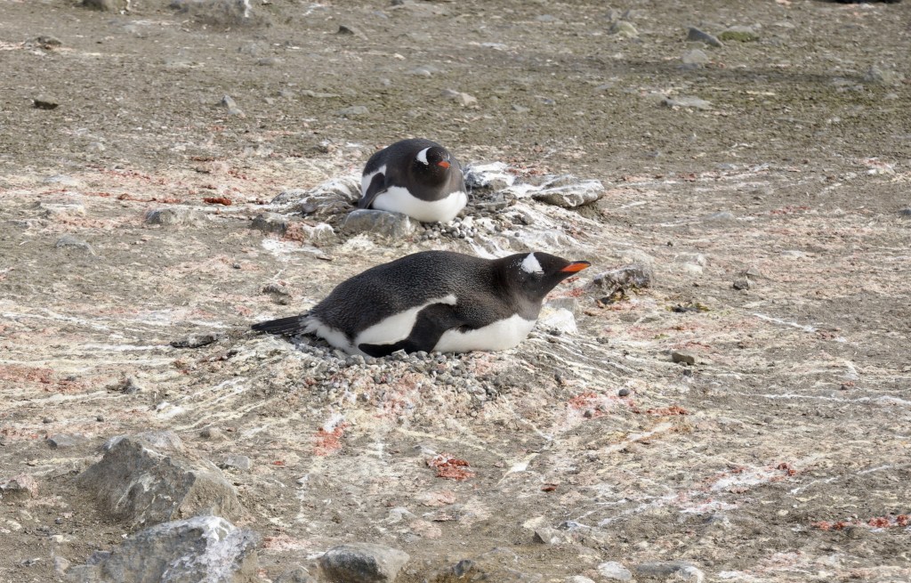 Unfortunately the penguins’ toilet habits are not up to modern standards and the nests are surrounded by distinctive guano stripes.